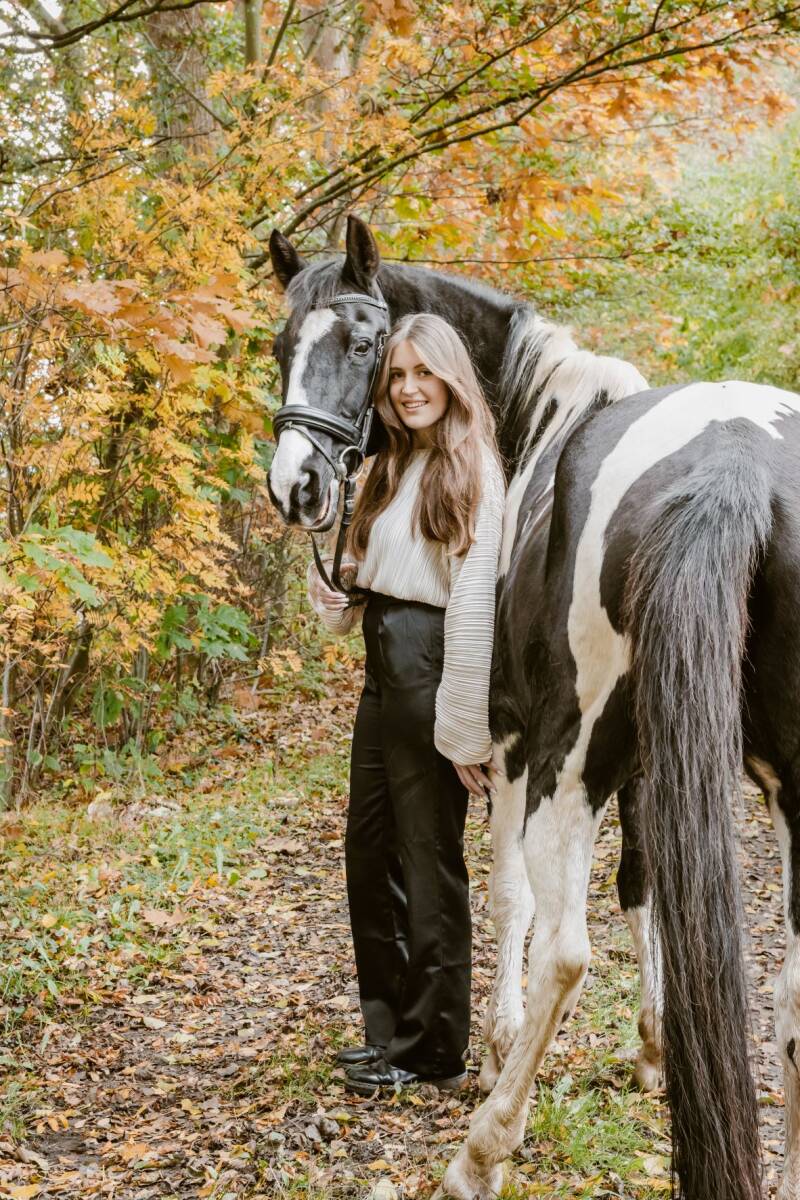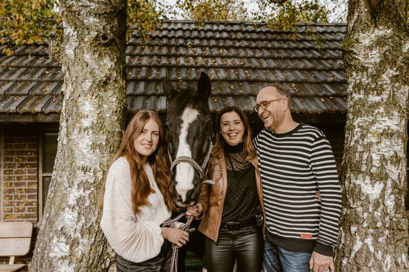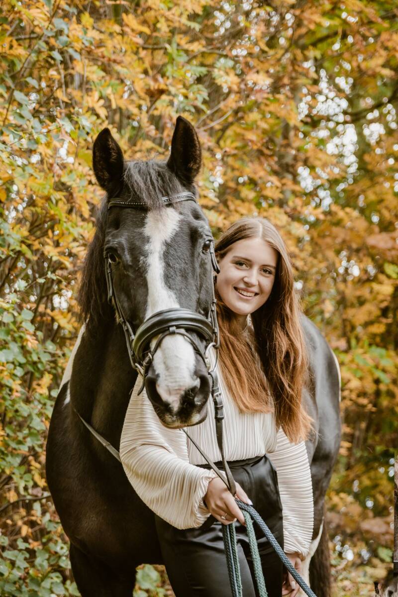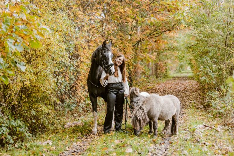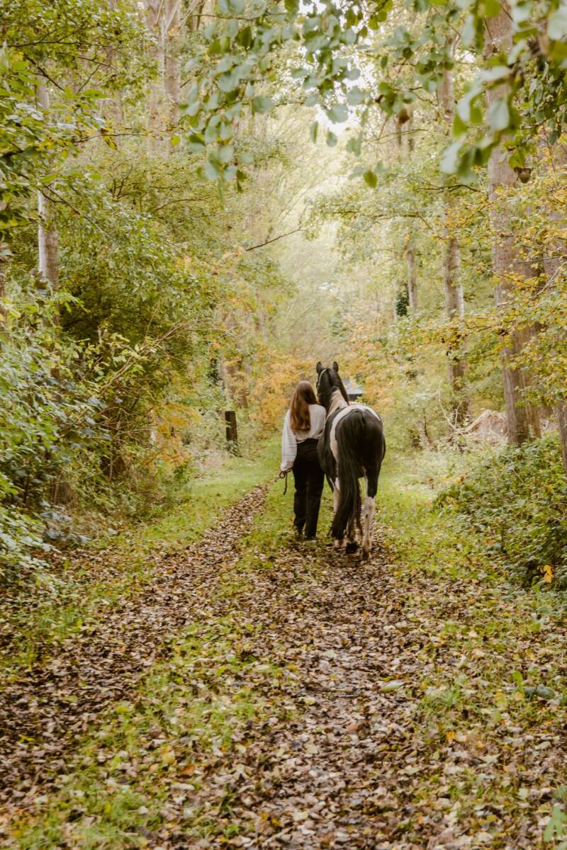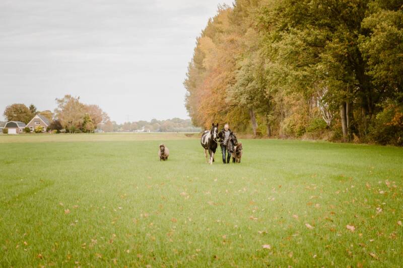 Eind oktober, toen de bladeren mooi gingen kleuren wilde Daisy graag een fotoshoot met haar paard Halloween. Dit paard hebben ze gered van de slacht en mag zijn oude dag slijten in de wei bij de familie van Daisy. Een eindje verderop van hun huis was een mooi bospaadje. Daar gingen we, Daisy met Halloween en Astrid en Dirk (ouders van Daisy) met de twee shetlanders. Dat moet vast een heel leuk gezicht zijn geweest.