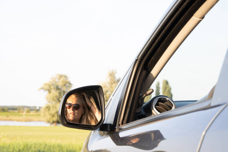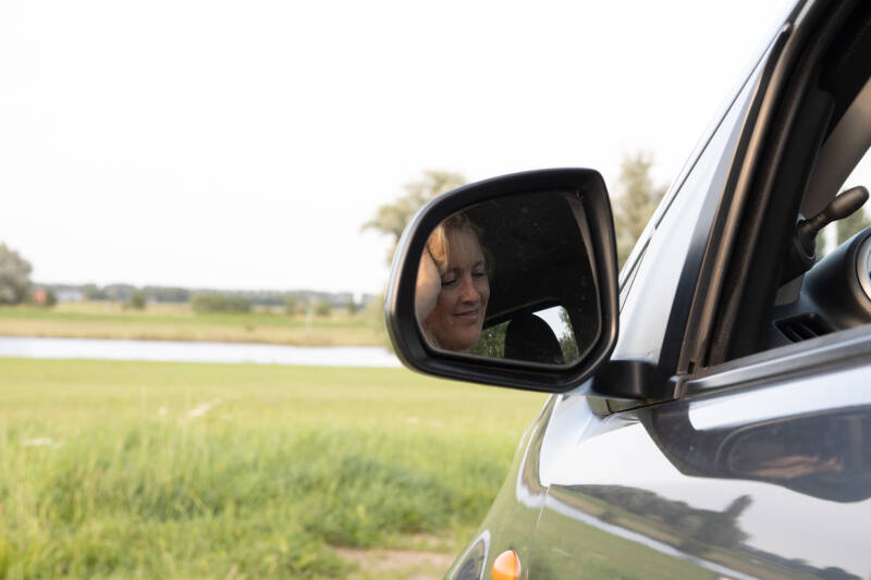Toen ik met het thema in mijn hoofd speelde had ik dit beeld ongeveer al bedacht. In mijn autootje ergens geparkeerd en dan via de spiegel in beeld. Ik stond op een stukje dijk en de mensen die langs liepen vroegen zich hardop af wat ik aan het doen was.